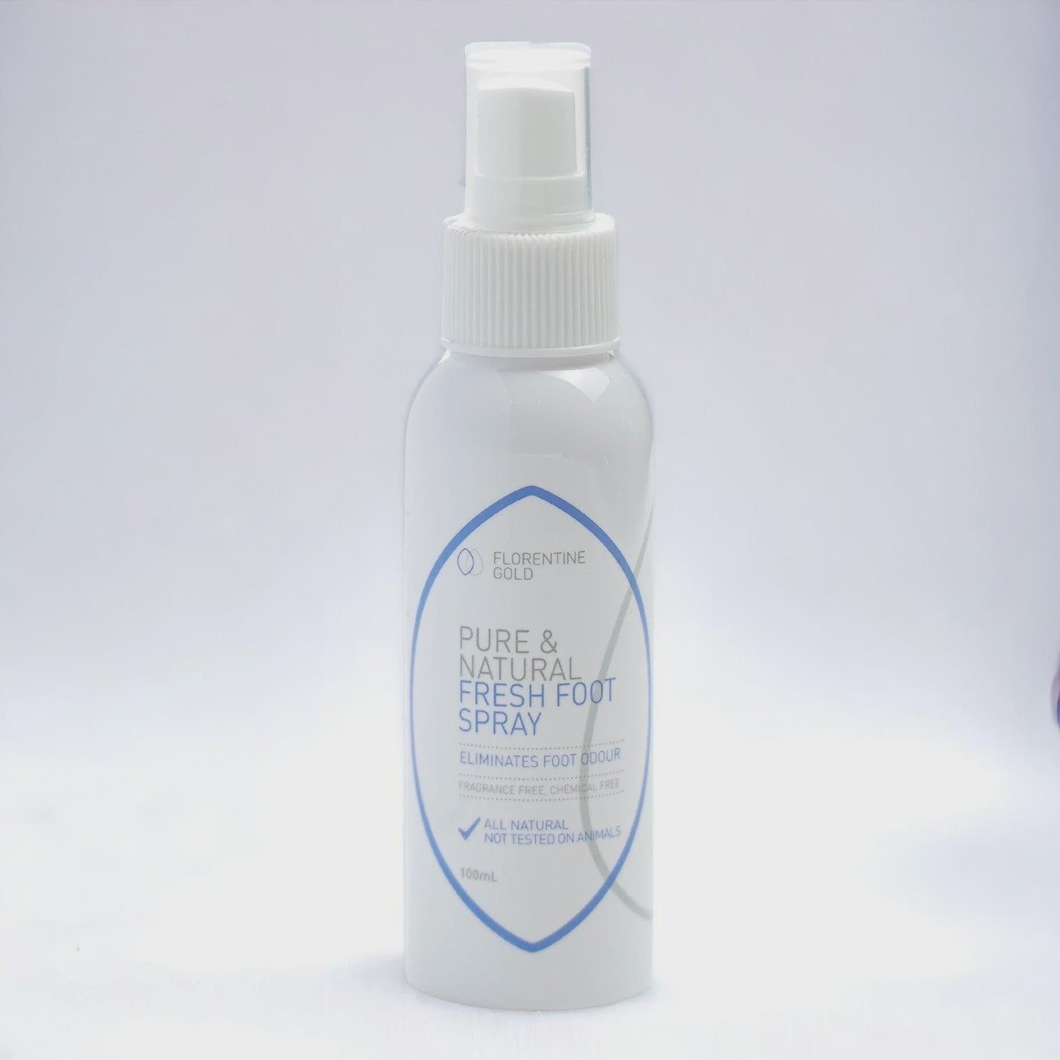 Florentine Gold’s Pure & Natural Fresh Foot Spray Deodorant 100ml. This fragrance-free foot deodorant is perfect for those with sensitive skin. A premium foot deodorant that’s 100% natural, it offers exceptional freshness and 24-hour protection. Our fresh foot spray deodorant is ideal for those who prefer a pure and effective personal care solution. a must for those with smelly feet and shoes.