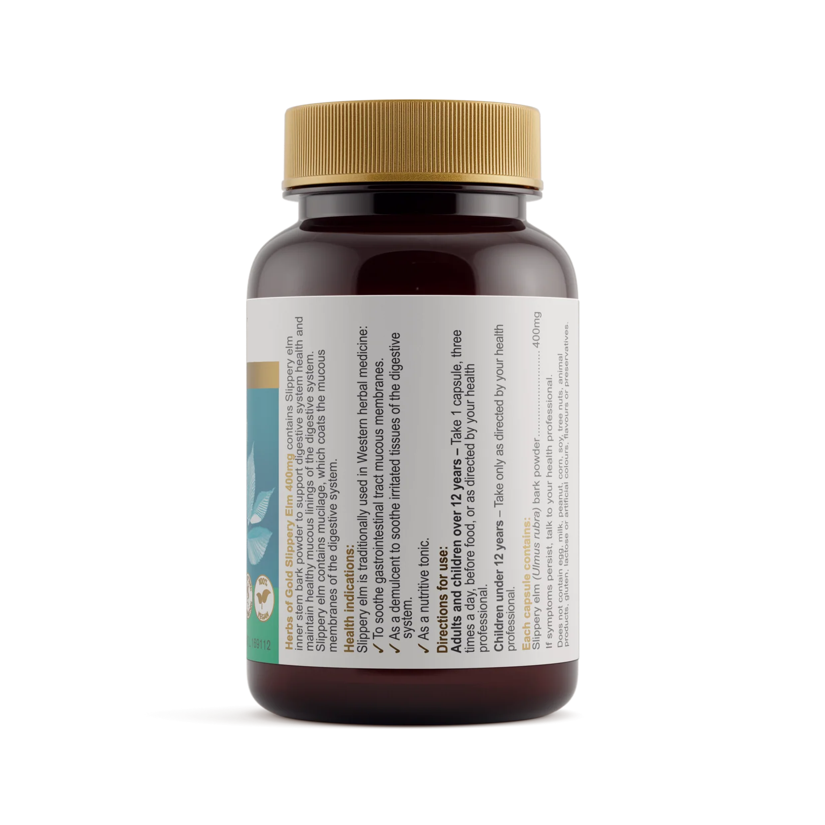 Herbs of Gold Slippery Elm 400mg supports digestive system health and healthy mucous linings of the digestive system.