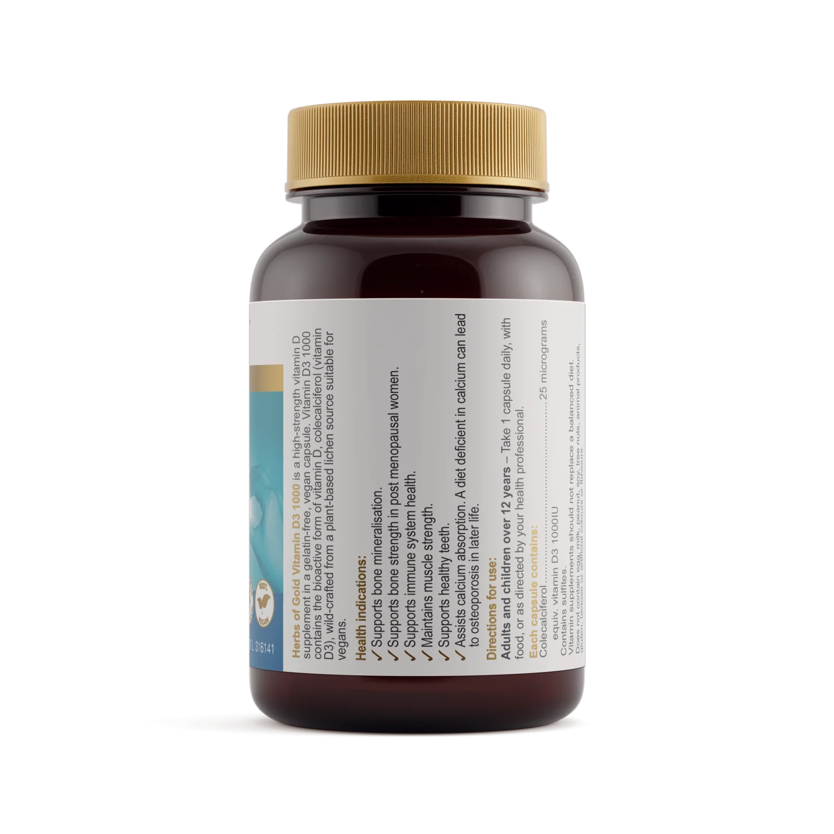 - Herbs of Gold Vitamin D 1000 contains a vegan-friendly vitamin D derived from lichen to support absorption of dietary calcium. Vitamin D helps calcium absorption and a diet deficient in calcium can lead to osteoporosis in later life.
