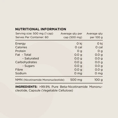 Our NMN is 3rd party tested to >99.9% purity. As we age NAD+ declines and supplementing with NMN has been shown to increase NAD+ levels to help support healthy ageing.